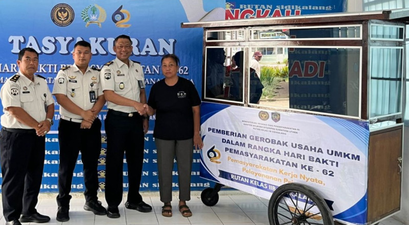 Selain prosesi syukuran internal, Rutan Sidikalang juga merealisasikan aksi kepedulian sosial melalui penyerahan bantuan gerobak UMKM kepada warga pelaku usaha mikro.